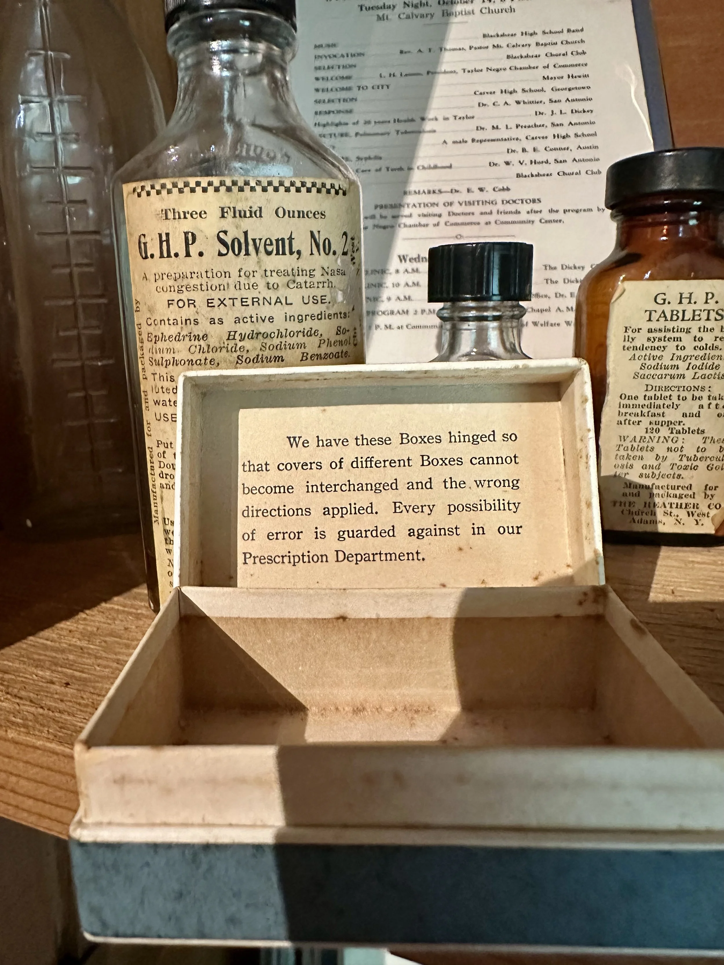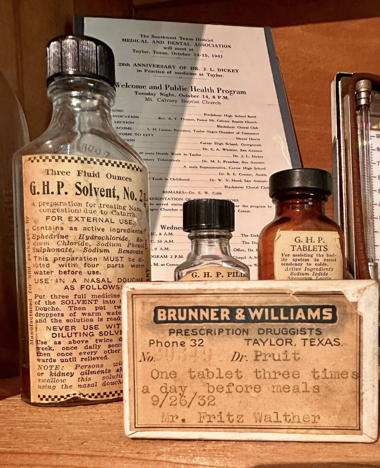 There was a pharmacy on Taylor’s Main Street named Brunner & Williams Druggists. The boxed medicine pictured was for a gentleman, Mr. Walther, who lived in Taylor in the early 1930s. Take note of the important message inside the box.