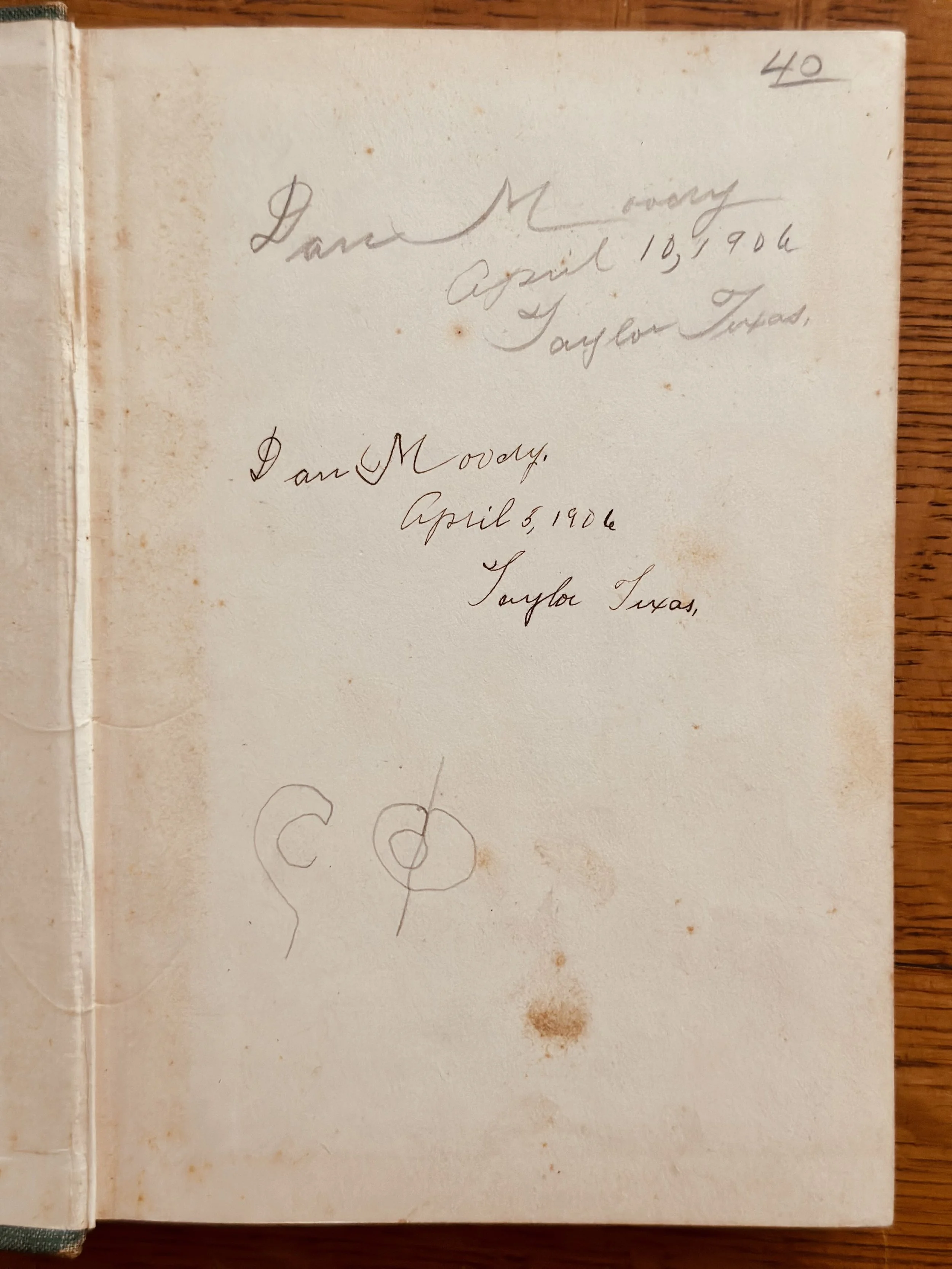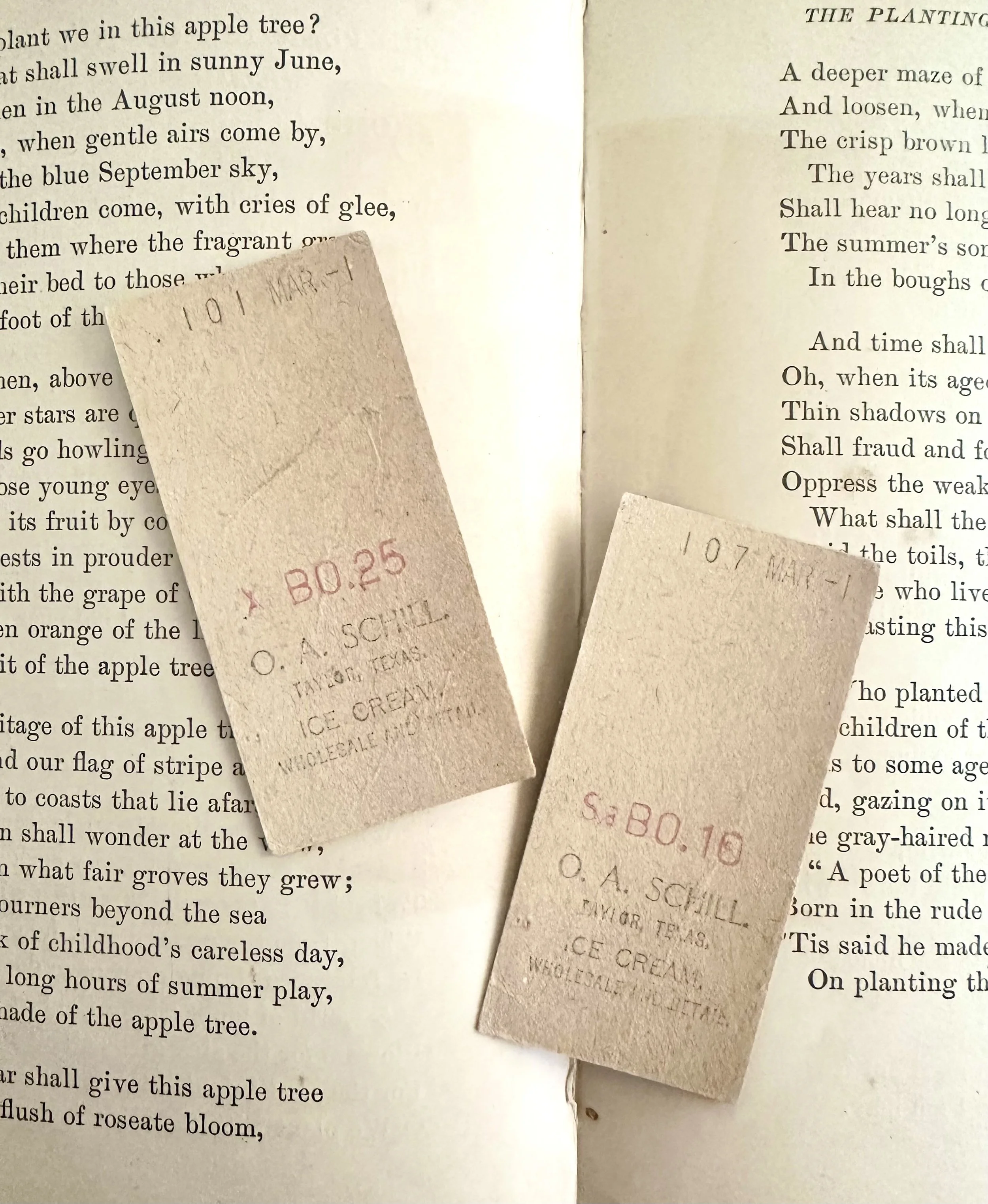While looking though a few old books at the museum, I happened upon what I thought was a book mark, yellowing with age, inside a textbook Dan Moody had in 1906 - he would have been about 12 or 13. The bookmark turned out to be 2 tickets for ice cream from O.A. Schill’s costing a whopping $0.10 and $0.25 respectively.