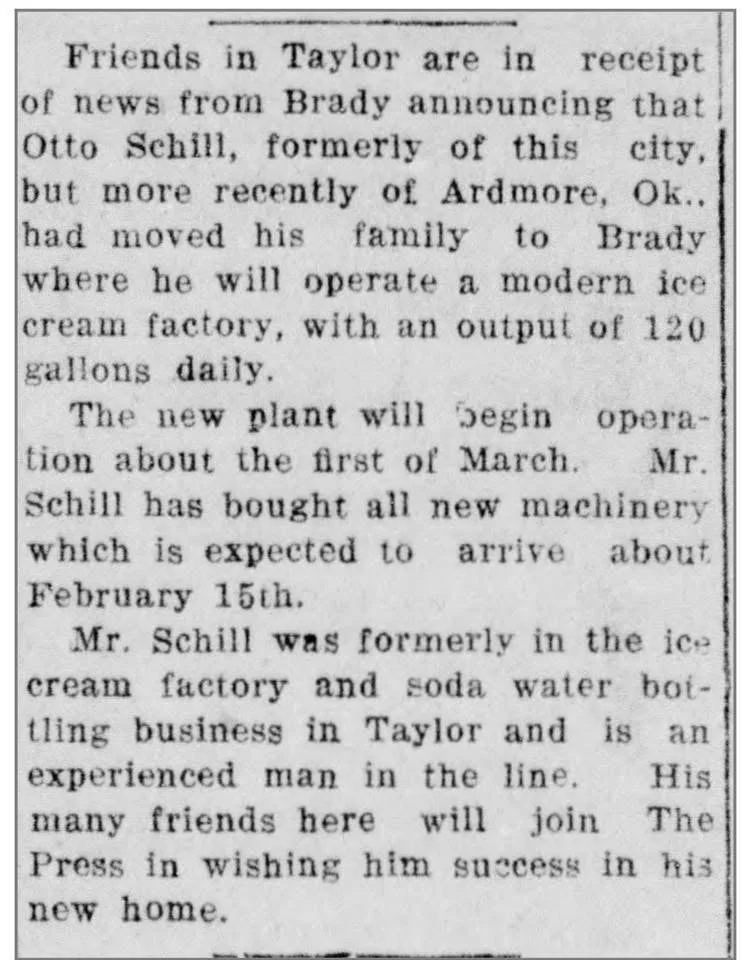 Thanks to Tim Mikeska and Brad Weber, I learned much more about Schill’s Ice Cream and Soda Water Business that existed in Taylor about 120 years ago. (See attached)