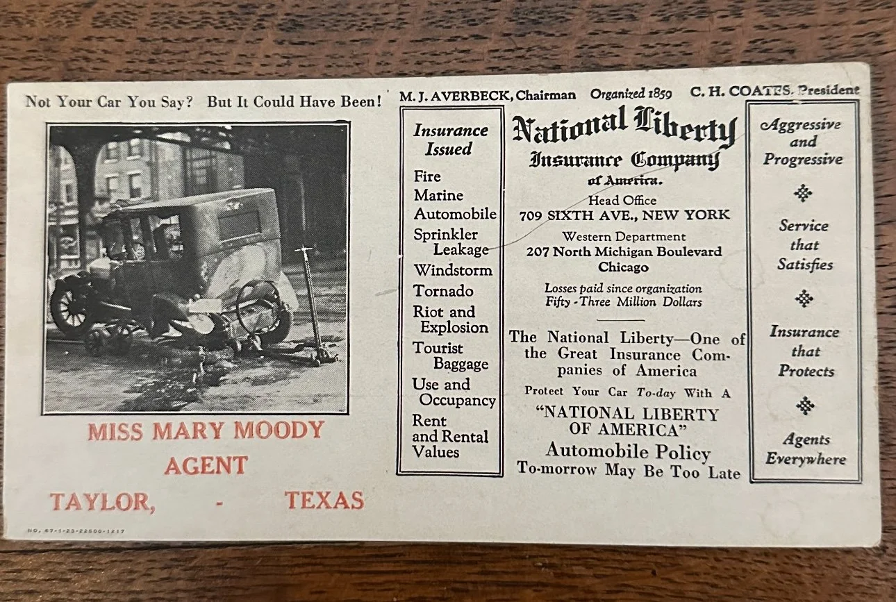Did you know that Mary Robertson Moody — sister of Texas Governor Dan Moody — once sold automobile insurance right here in Taylor, Texas? We recently uncovered this incredible 1920s–30s promotional card from the National Liberty Insurance Company of America, where Mary is listed as the local agent.