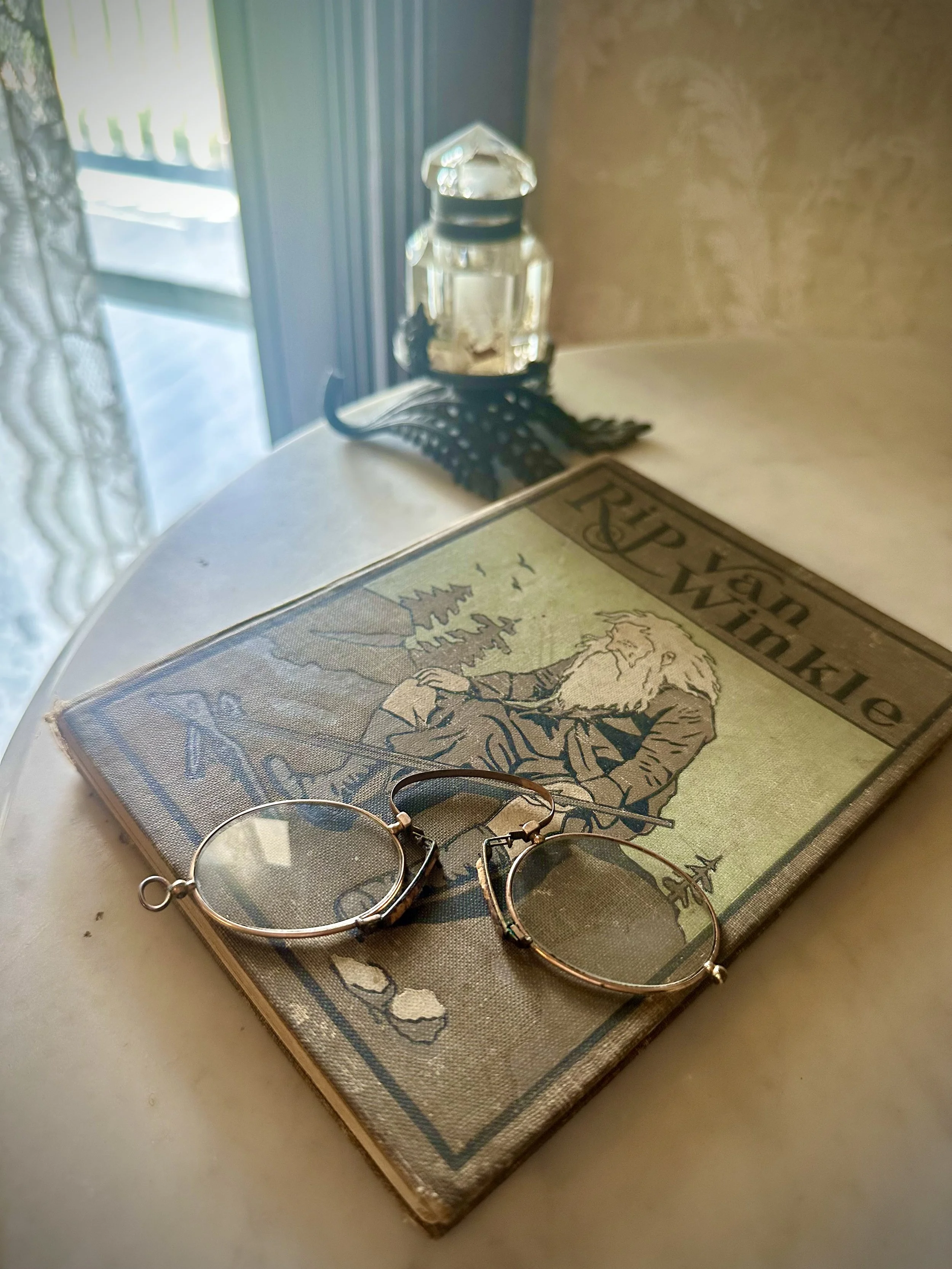 In addition to the book, the antique pinched-nose glasses (pince-nez) were popular in the late 1800s and early 1900s. They were often worn for reading as they were not cumbersome and simply pinched on the bridge of the reader’s nose.