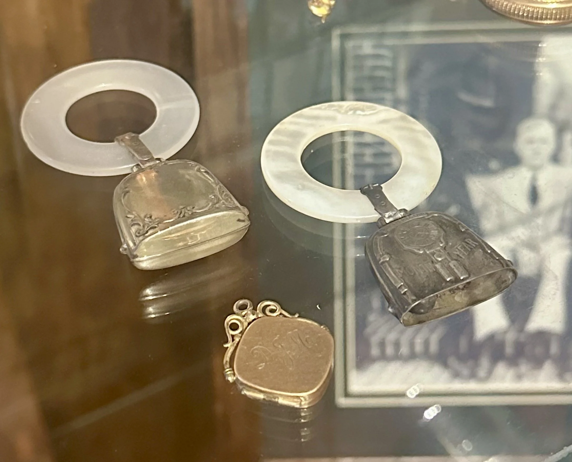 These are Dan and Mary’s teething rings from the 1890s. Victorian mother-of-pearl teething rings were smooth, iridescent rings made from nacre, valued for being hard, non-toxic, and soothing for teething babies. They were often paired with a sterling silver rattle which added both entertainment and status. These combined teether–rattles were luxury baby items popular among wealthy families in the 1800s, blending practicality with decorative craftsmanship.