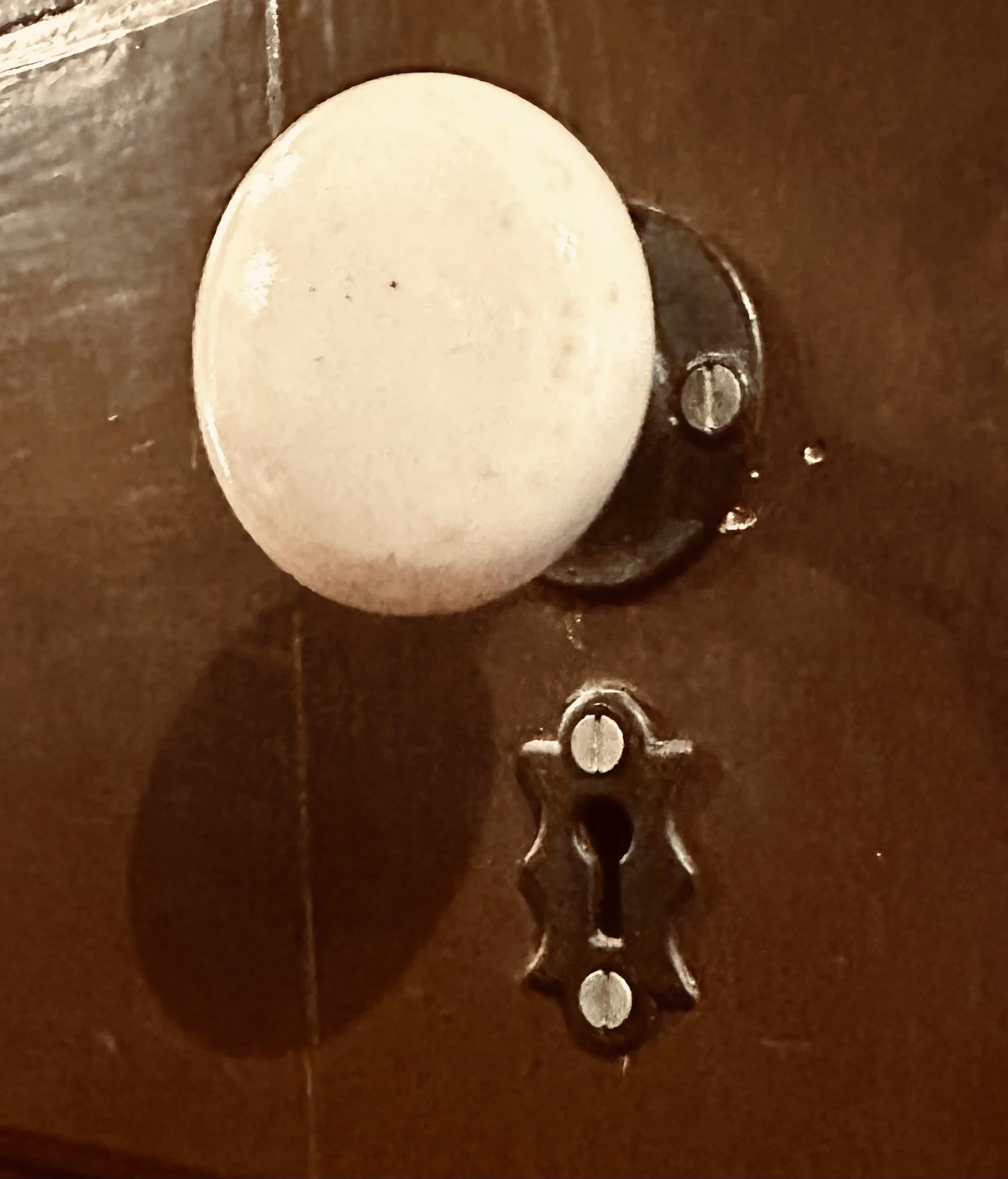 Throughout this 1887 home, original porcelain door knobs remain, most paired with brass or iron backplates and keyholes—though the matching keys have long been lost. Popular in the late 19th century, these knobs were valued for their smooth, durable finish and elegant appearance. They reflect the Victorian era’s attention to decorative detail while serving the practical function of operating locks. Even without keys, they add a charming, period-authentic touch to the home’s interiors.