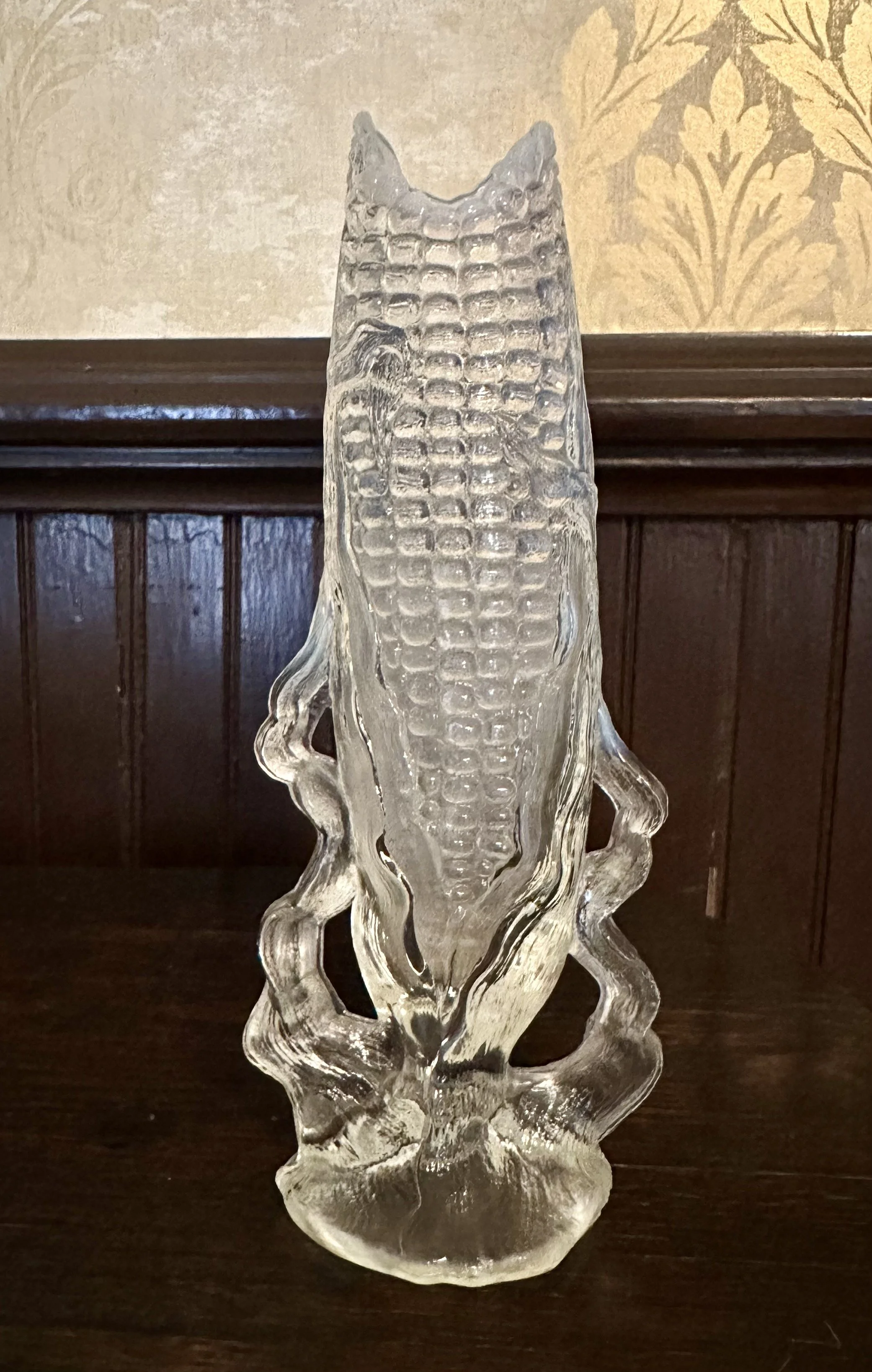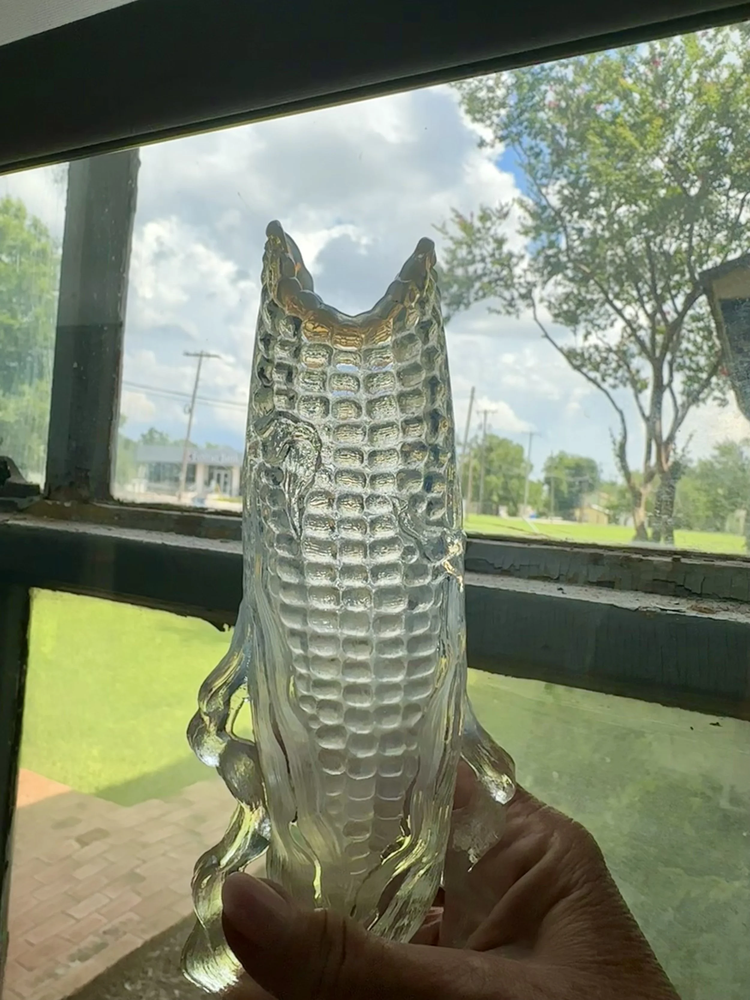This beautiful Art Nouveau corn vase predates World War I and is now on display in the Moody Museum dining room. The opalescent rim turns amber-colored when exposed to direct sunlight because it is made from uranium-free, heat-sensitive glass with manganese or iron. This type of glass was used prior to 1915.